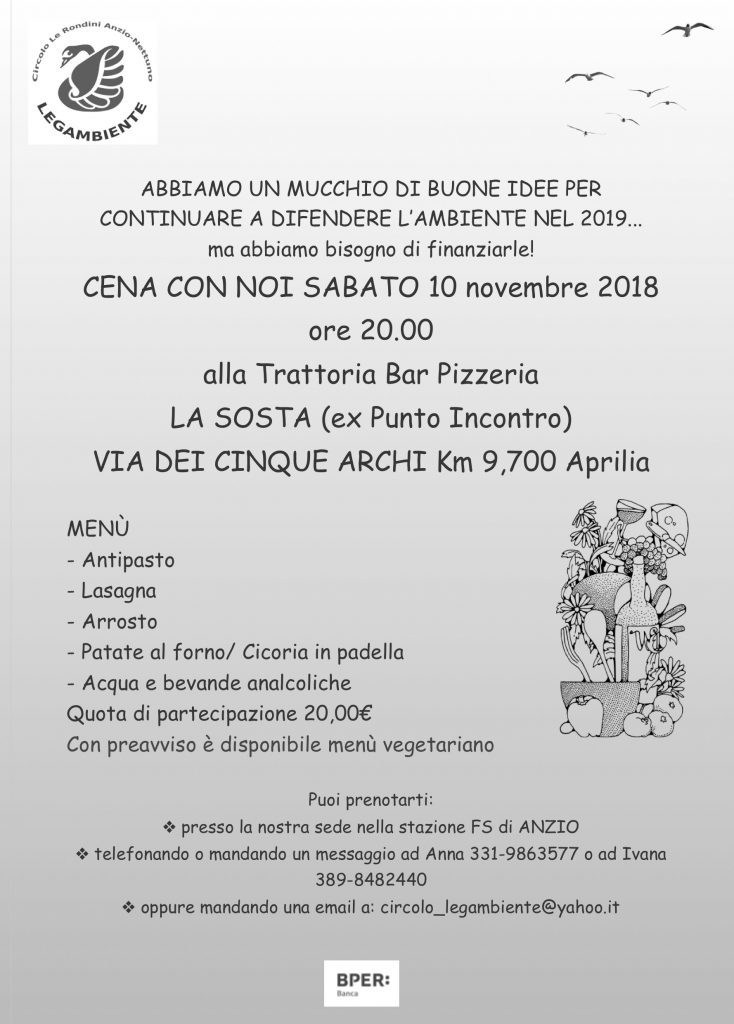 14 Ottobre 2018iniziative locali30 novembre 2018, anzio, aprilia, cena, circolo, eventi, Legambiente, rondini, sostegnoadmin Torna immancabile un’altra cena a sostegno del Circolo le Rondini di Anzio. Aiutaci a sostenere le tante iniziative in corso ed a iniziarne di nuove grazie al tuo sostegno e porta tante altre persone con te!!!