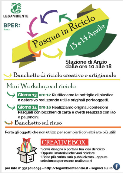 Sabato 13 e domenica 14 nell’atrio della stazione di Anzio allestiremo un laboratorio sul riciclo dei materiali e probabilmente anche una mostra fotografica. Sarà possibile acquistare con un piccolo contributo materiali decorativi e da regalo “pasquali”.