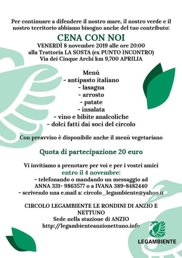 Venerdì 8 Novembre, ore 20, alla Trattoria LA SOSTA in Via dei Cinque Archi km.9,700 APRILIA:
