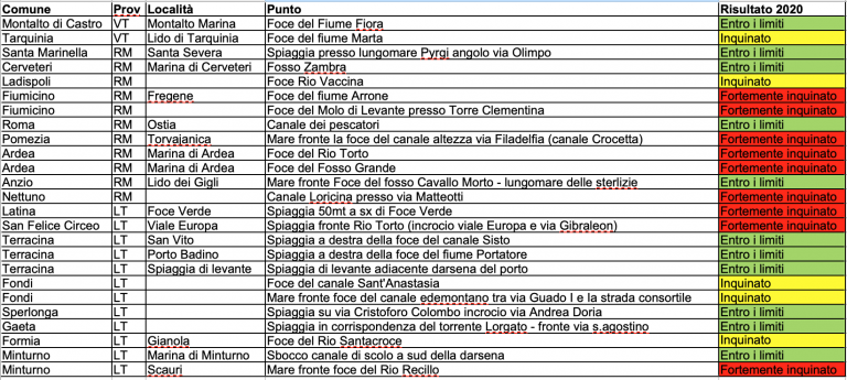 I risultati del monitoraggio delle acque di balneazione nel Lazio si possono trovare in https://golettaverde.legambiente.it/2020/07/17/sulle-coste-del-lazio-14-punti-su-25-oltre-i-limiti-di-legge/